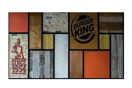 The Collage Wall creates a unique focal decor feature that emphasizes natural materials, branded BK logo, and handmade stencils. Available in three approved designs: A, B, or C (picture to the right shows design A).